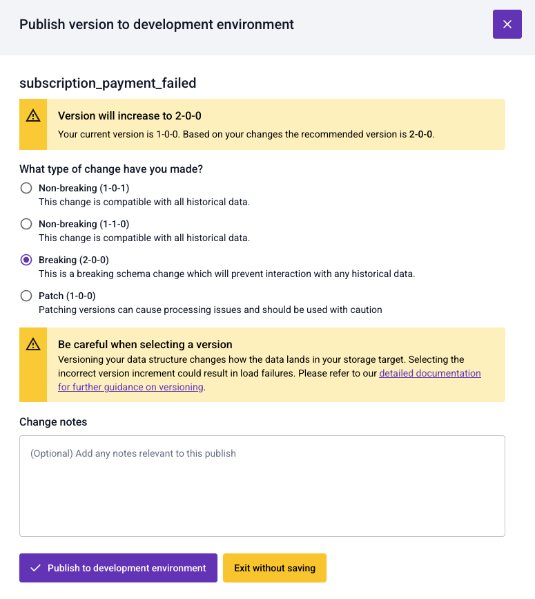 patchnumber i.e.1-0-0->1-0-1, or the middle digit i.e.1-0-0->1-1-0. - Breaking - a breaking change is not backwards compatible with historical data and increments the