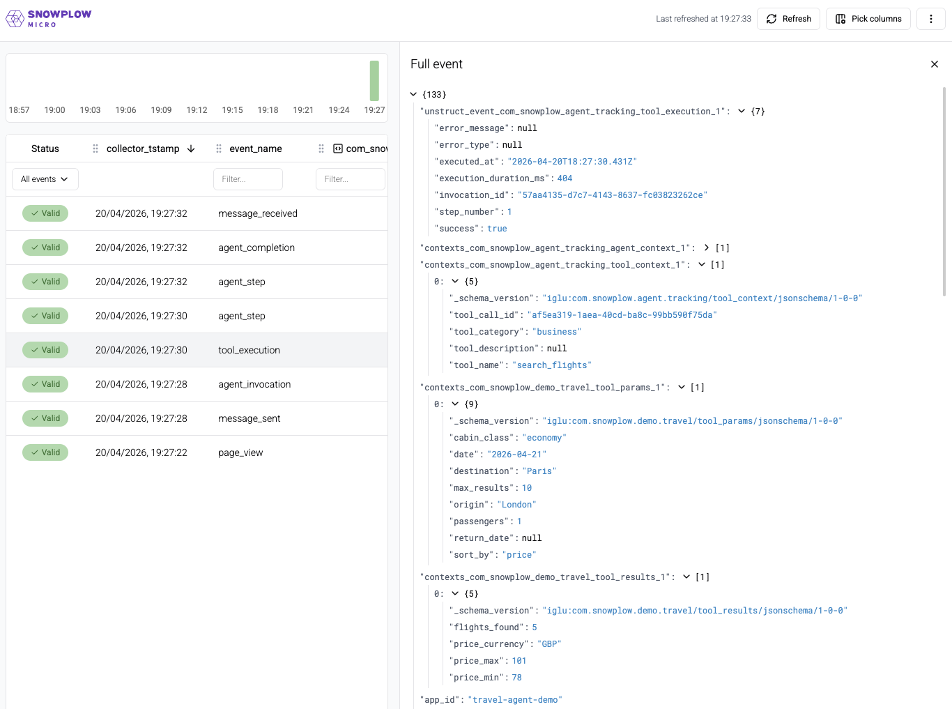 Check out the Schema reference section below for details on the Iglu Central schemas used for the server-side tracking. They capture the agent lifecycle - that a tool was called, how long it took, and whether it succeeded. These questions are generic to any agentic application.