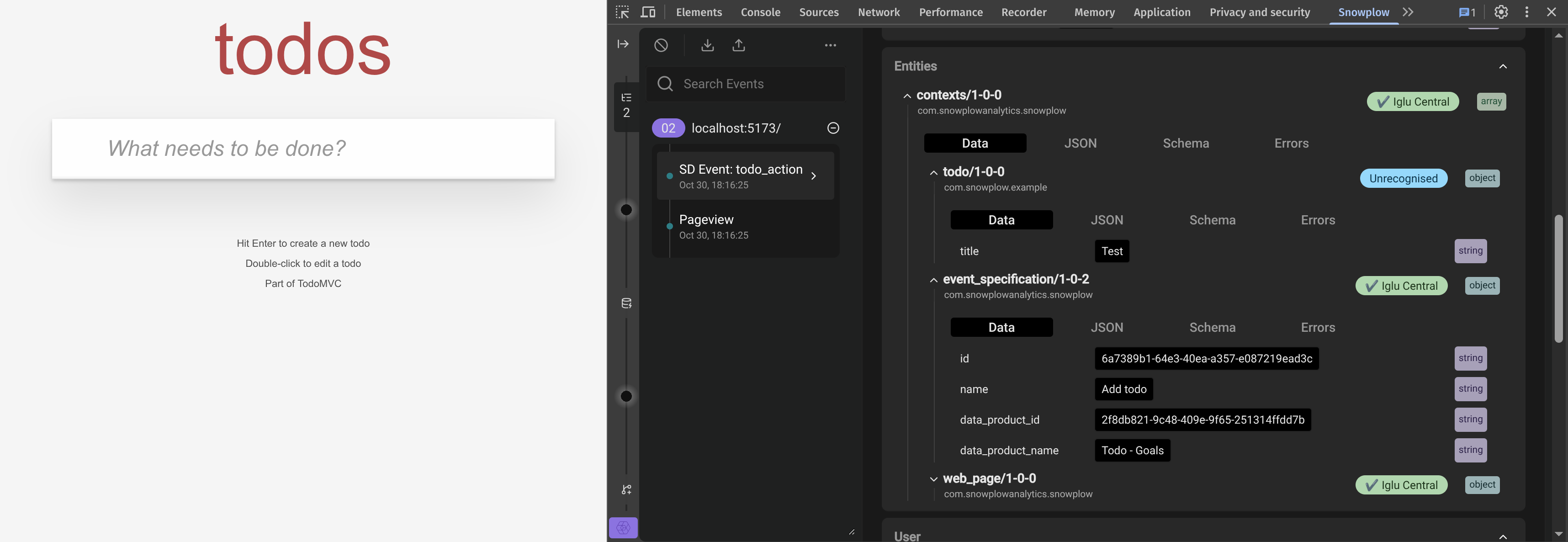 Finally, you can go to the application, add a new todo and observe on the Snowplow Inspector extension as the addition Event Specification is being sent. The event contexts should include the todo, event_specification and any other extra context you might add.